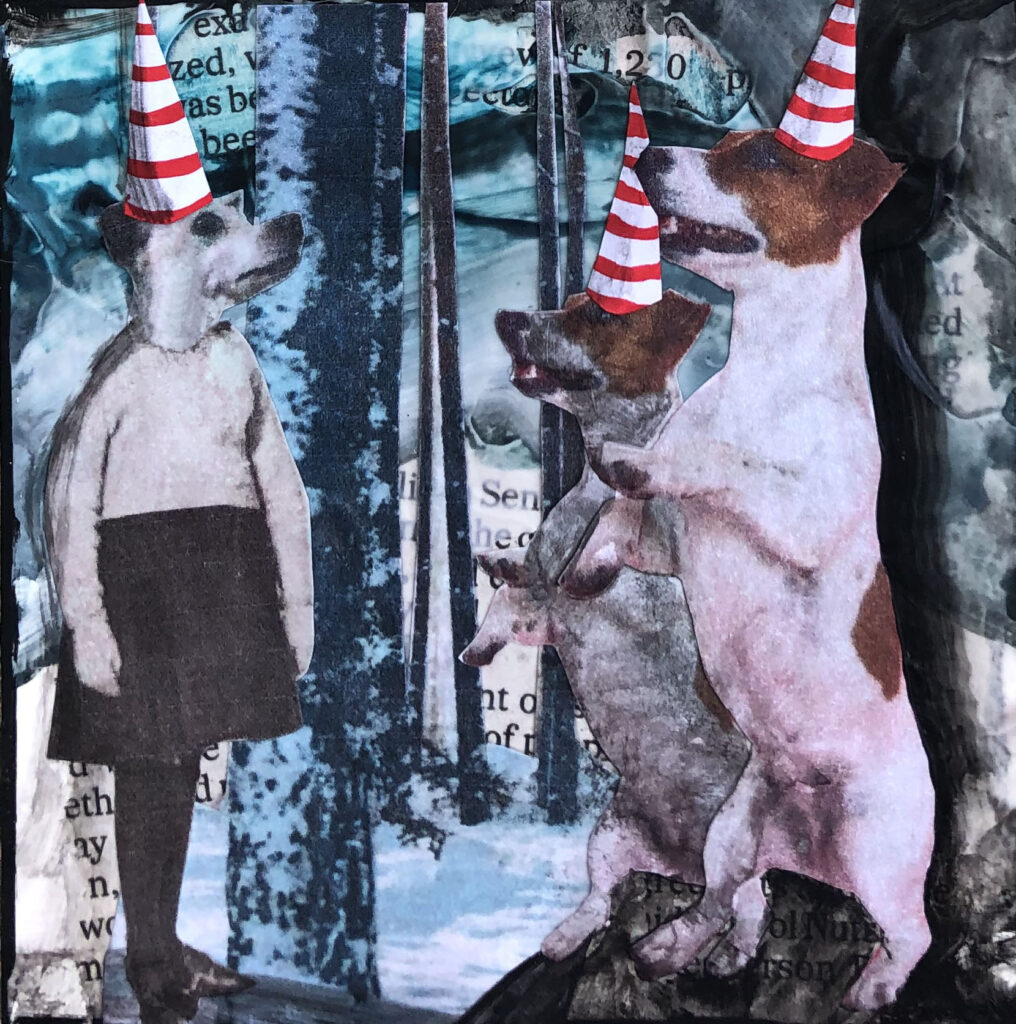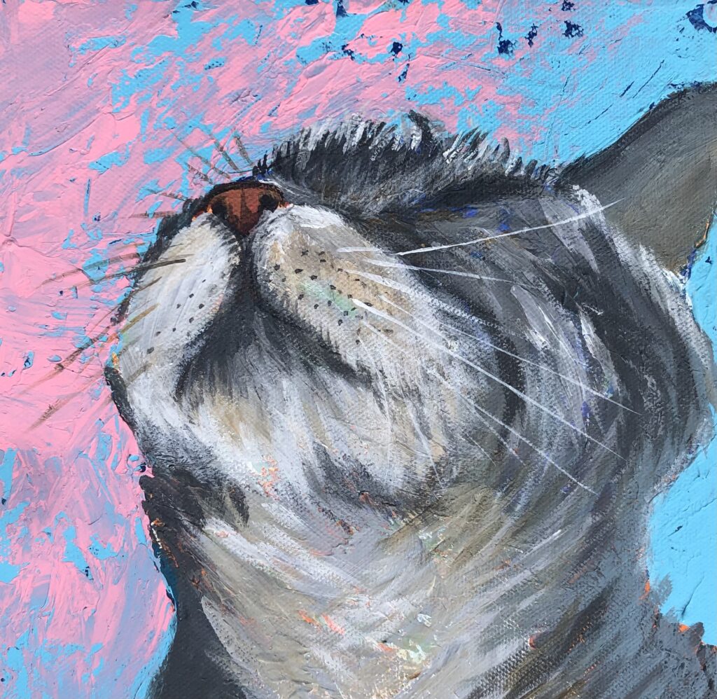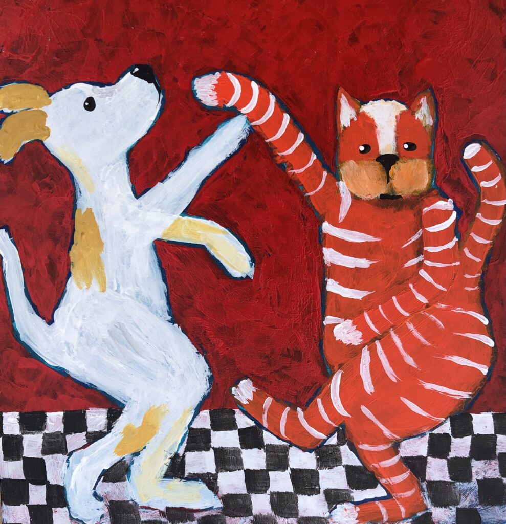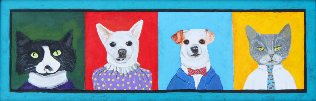 It was soon after school that I met my husband. I took what I thought was going to be a short break, but ended up being a 30-year break to enjoy and endure marriage and raise four thoroughly amazing children. After the children were grown, I jumped back in to creating art, but my focus had completely changed from that of an angsty young woman, to a joyful woman, whose life had become full of animals, fun and humor. My paintings now reflect this outlook on life.